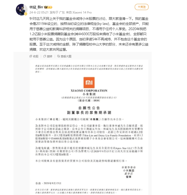 林斌表示,其基金会是2019年设立的,按照当初设立的法律规定,基金会的全部资产,只能用于慈善公益和教育科研相关的捐赠项目,不得用于任何个人享受。2020年林斌把1.2亿股小米股票捐赠到基金会(其中6000万股后来捐给了小米基金会),全部都只能用于慈善公益。因为这个原因,当初承诺5年不再减持,并不包含这个基金会的股票。至于这次减持的金额,除了捐赠母校中山大学的部分,未来还会有更多公益捐赠。