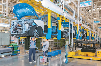 近日,在山西省运城市大运新能源汽车总装车间内,技术工人在装配新能源汽车,确保订单高质量如期交付。金玉敏摄(人民视觉)