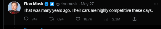 马斯克显然记得这段采访视频,很诚恳地回答说:“这是很多年以前的事了。如今,比亚迪的汽车极具竞争力。”