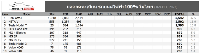 同时,在2023年第一季度,BYD ATTO 3的泰国上牌量为5542台,占一季度纯电动车上牌总量的37.5%。