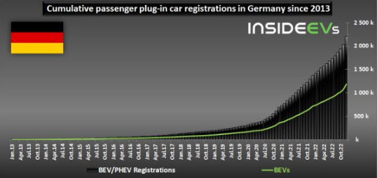 该媒体表示,自2013年1月至2022年10月,德国新注册的电动汽车原始累计数量达到100万辆,而目前这一数字超过了118万辆,加上略高于100万辆插电式混合动力车,德国目前累计注册的可插电新能源汽车达到了220万辆。但是,如果排除已停止使用或在国外销售的汽车,则很有可能目前正在使用的电动汽车的数量为100万辆。
