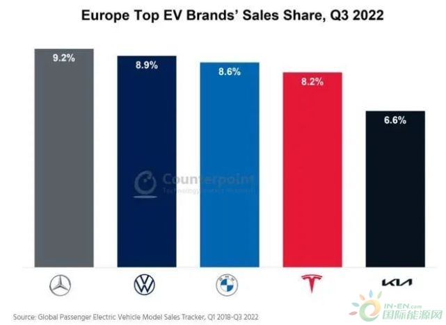 根据 Counterpoint的最新研究,欧洲乘用电动汽车(EV)销量在 2022 年第三季度同比增长 17%。纯电动汽车 (BEV)占本季度电动汽车总销量的 61%。德国是该地区最大的市场,占总量的1/3,其次是英国和法国。
