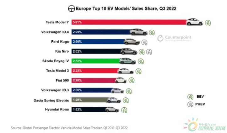 2022 年第三季度,欧洲前 10 大电动汽车车型占电动汽车市场的 27% 左右。最畅销的电动汽车是特斯拉 Model Y、大众 ID.4 和福特 Kuga。