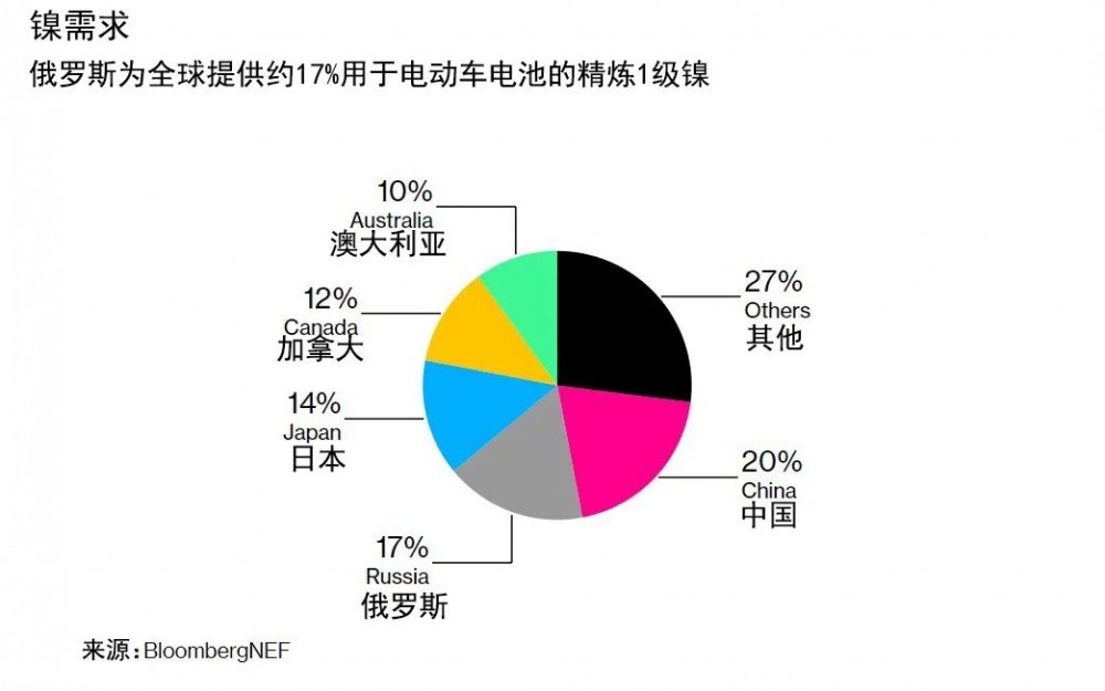 镍是电动车电池的重要成分,而俄罗斯是世界上最大的镍生产国之一,为全球提供约17%的精炼1级镍。自俄乌冲突爆发以来,多国对俄罗斯实施制裁导致镍供应不足。