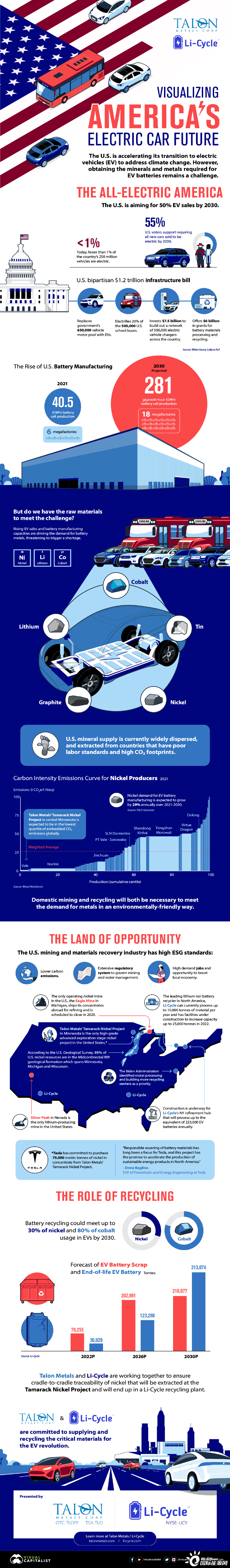 美国正在加速向电动汽车 (EV) 过渡以应对气候变化。然而,获得电动汽车电池所需的矿物质和金属仍然是一个挑战。VirtualCapitalist发表来自 Talon metals 和 Li-Cycle 的信息图,探讨美国制造汽车、电池和关键部件的战略。