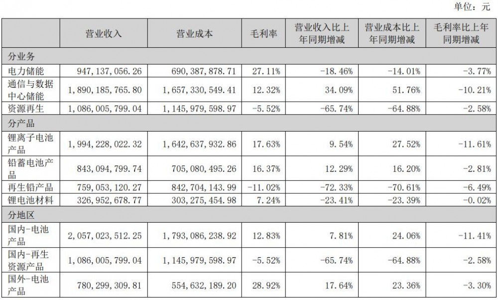 到行业上,电力储能业务达到9.47亿元,同比减少18.46%;通信与数据中心储能业务收入达到18.9亿元,同比增长34.09%。
