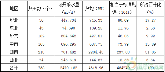 就目前已勘查可利用地热资源而论,以中国西南地区最为丰富,已探明可利用地热能达2 204.45MW,占全国勘查探明可利用地热能总量的51.05%;其次是华北和中南地区,分别探明可利用地热能达745.33MW和 685.75MW,占全国可利用地热能总量的17.27%和15.89%;再次为华东地区,占9.92%;而以东北、西北地区最少,已探明可利用地热能分别仅占全国总量的2.53%和3.34%。