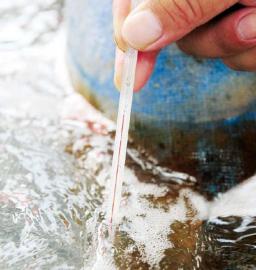 据颍州晚报报道,近日,颍州市目前最深的一眼地热井成功出水,技术人员在水箱排水处用温度表测水温。