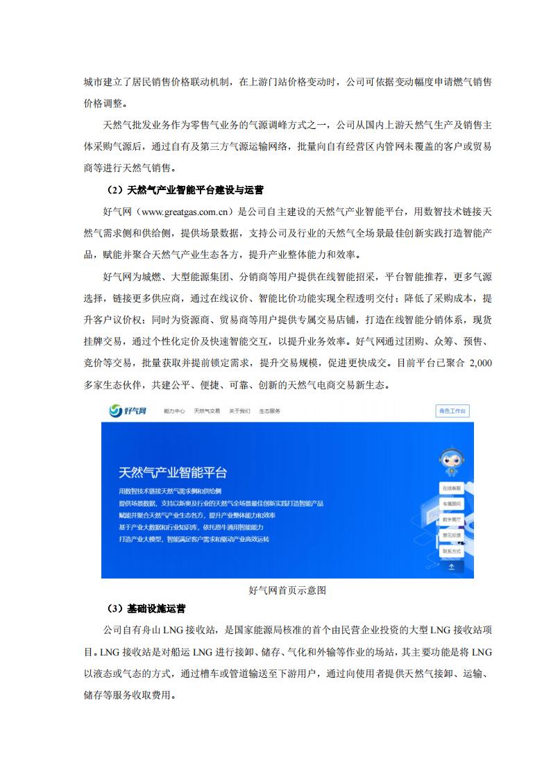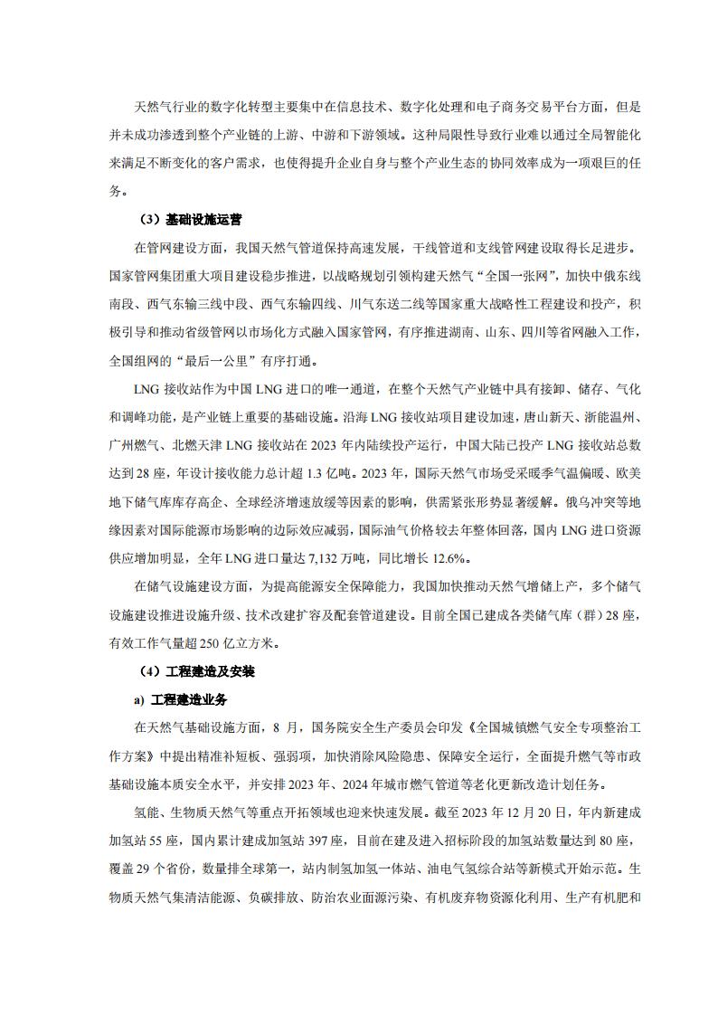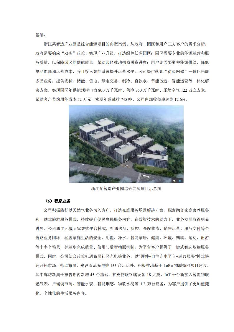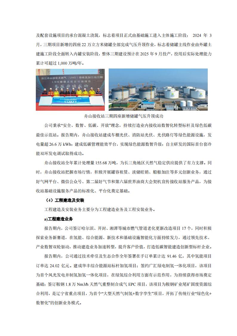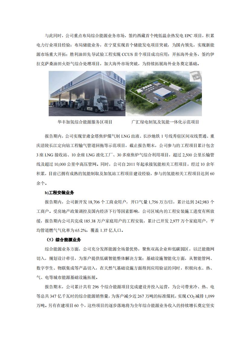 此外,报告期内,新奥股份还通过技术牵引及生态合作全年签署在手订单累计达 91.46 亿,其中氢能项目订单达 24.02 亿元。建成华丰综合能源站标杆加氢项目;签约广汇绿电制氢一体化项目,该项目为首个风光发电并制氢加氢一体化项目,在绿氢综合利用方面有示范作用,为持续获得市场奠定基础;签订鞍钢 1.8 万 Nm3/h 天然气重整制合成气 EPC 项目,该项目为鞍钢矿业尾矿固废资源综合利用,是辽宁省重点项目,为首个“大型天然气制氢+数字孪生”项目,开拓了传统行业“绿色化+数智化”的创新业务模式。