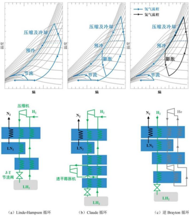 液氢的制备方法有Linde-Hampson法(令氢气的体积瞬间膨胀,压力下降,从而使氢气自身温度降低,产生制冷效应)、Claude法(通过多级透平膨胀机使氦气膨胀降温至液氢温区,随后通过换热器向氢气提供冷量转化为液氢)以及逆Brayton法(直接将一部分高压氢气作为制冷介质经透平膨胀机输出功获取冷量)。
