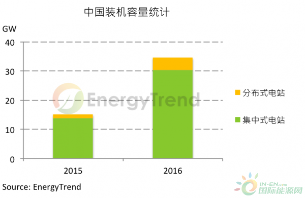 中国国家能源局甫于新年假期过后发布统计:截至2016年底,中国光伏累计装机量达77.42GW,2016全年新增装机容量为34.54GW,比起2015年15.13GW已是翻倍成长。若扣除约4~7GW在2015年已安装但延至2016年并网的装机量,2016年中国实际需求近30GW,高于先前预期。其中4.24GW为分布式光伏安装量,比起2015年的1.39GW成长率更是高达200%。