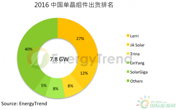 去年最受瞩目的单晶风潮实际也大有起色,在领导厂商将常规单晶与多晶组件价差控制在US$ 0.01 / W的推动之下,单晶产品藉由高性价比,在过去以多晶为主的中国市场成长至市占超过25%,虽乐叶、晶澳、天合仍为中国内需单晶组件主要供货商,但有越来越多的电池片、组件供货商在去年加入单晶战局,使得前述三大供货商在中国内需之单晶占比已略低于50%,也显示单晶热潮的蓬勃发展。