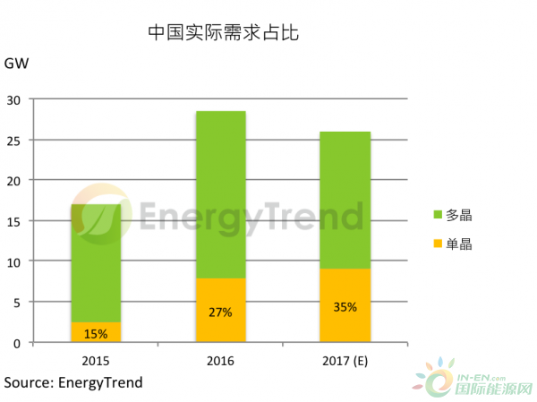 整体而言,2015单多晶价差过大而造成的单晶占比低谷已经过去,虽中国内需在2016接近30GW的并网量达到高峰,后续需求将略有衰退,但预期2017年仍有超过25GW的安装量。而单晶将在领跑者、PERC的推动下市占率持续攀升,虽今年多晶硅片使用金刚线切降本之议题火热,但受到配合的蚀刻技术路线尚未明确影响,预期需待第三季开始才能逐渐放量,单多晶性价比的再度拉锯需等下半年才会逐渐显现。今年单晶在中国能占比应能站上35%,明年是否继续维持高成长,单晶与多晶硅片后续的降本空间将是关键。