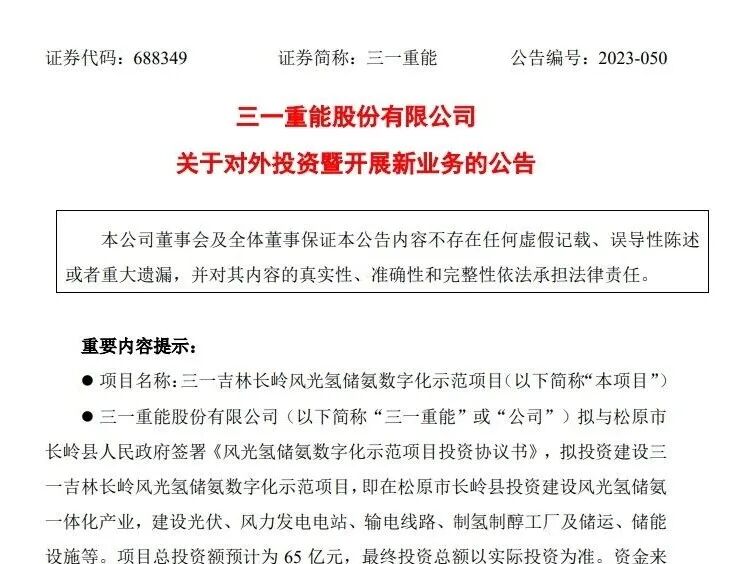 11月14日,三一重能公告披露,三一重能股份有限公司(简称“三一重能”)拟与松原市长岭县人民政府签署《风光氢储氨数字化示范项目投资协议书》,拟投资建设三一吉林长岭风光氢储氨数字化示范项目,即在松原市长岭县投资建设风光氢储氨一体化产业,建设光伏、风力发电电站、输电线路、制氢制醇工厂及储运、储能设施等。项目总投资额预计65亿元,最终投资总额以实际投资为准。资金来源为公司自有资金及自筹资金。