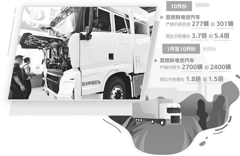 中国汽车工业协会数据显示,10月份,氢燃料电池汽车产销分别完成277辆和301辆,同比分别增长3.7倍和5.4倍。1月至10月,氢燃料电池汽车产销分别为2700辆和2400辆,同比分别增长1.8倍和1.5倍。