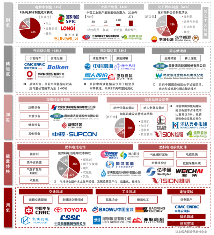 中国氢能产业链分为制氢、储运氢、加氢、能量转换(燃料电池)、用氢。