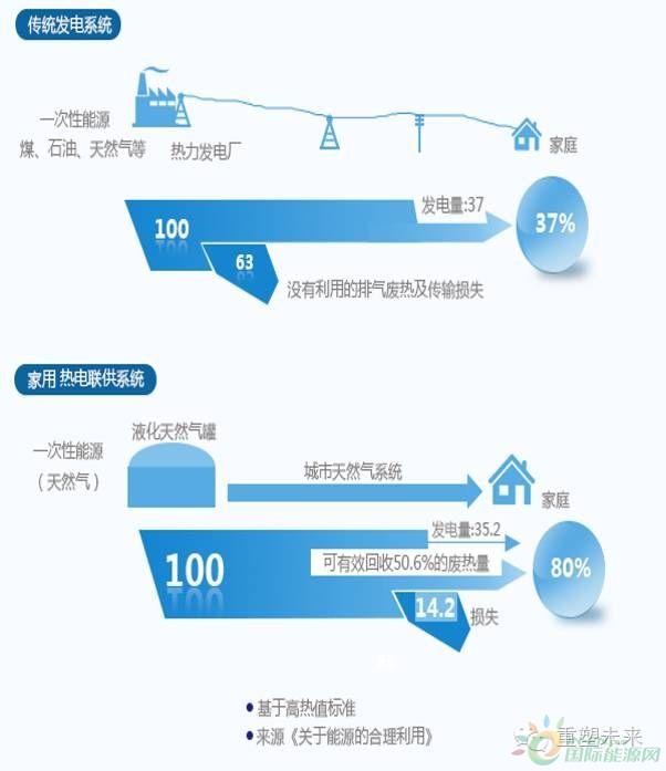 反观家用热电联产系统,一次能源直接在用户端进行能源生产,燃料电池解决了燃机小型化程度有限的问题而能够完美地作为家用能源站的核心设备。该系统的整体热效率高于85%,远远大于集中式生产的50%终端热效率。
