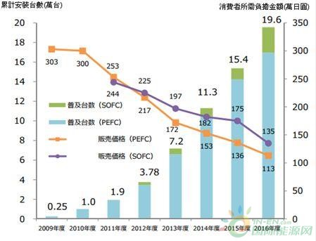 在2009年产品推广前夕,日本政府同意每套燃料电池补贴140万日元或者制造成本的一半,并做出补贴多年的承诺。虽然每套设备的补贴力度下降,但是总的补贴预算不断升高。在2009年大约安装了2300套燃料电池设备,现在这个数字已经慢慢增长至超过12000套,而每套设备的补贴则降至了500000至600000日元。而从2012年开始销售量差不多翻倍。2015年ENE-FARM的补贴金额达到了222亿日元,这一轮补贴到2016年年底已经结束。