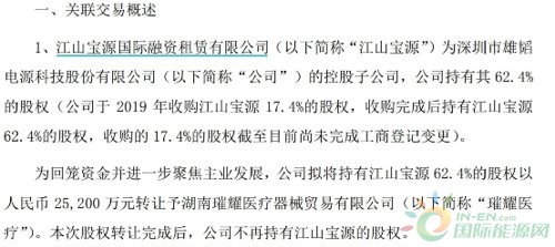 根据雄韬股份公告显示,公司拟将持有的江山宝源国际融资租赁有限公司(江山宝源)62.4%股权以2.52亿元转让予湖南璀耀医疗器械贸易有限公司。而本次股权转让完成后,雄韬股份不再持有江山宝源的股权。