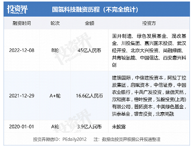 其中,去年12月,国氢科技完成45亿元B轮融资,投后估值高达130亿元。此次国氢科技一举新引入了11家投资方:国开制造、绿色发展基金、混改基金、川投集团、嘉兴国禾投资、武汉经开投、北京大兴投资、尚融绿能、共青城氢能、中国信达、西安唐兴科创。