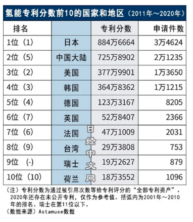 2011~2020年,中国的氢能专利申请超过2万件,增至2001~2010年的近10倍,与此同时日本的申请件数却减少近3成,中日两国的差距正在迅速缩小。