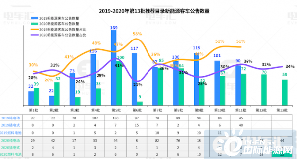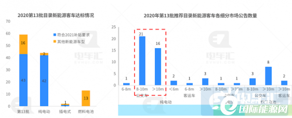 在第13批新能源汽车推荐目录中,客车整车产品有59款,10米以上及8-10米纯电公交为主力车型,其中纯电动车型44款、插混车型2款、燃料电池车型13款,燃料电池产品持续爆发。