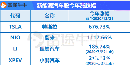 受益于行业渗透率的提升,新能源汽车股今年股价大幅上涨,特斯拉、蔚来、理想和小鹏今年涨幅分别为676.73%、1117.66%、185.74%和213.13%。
