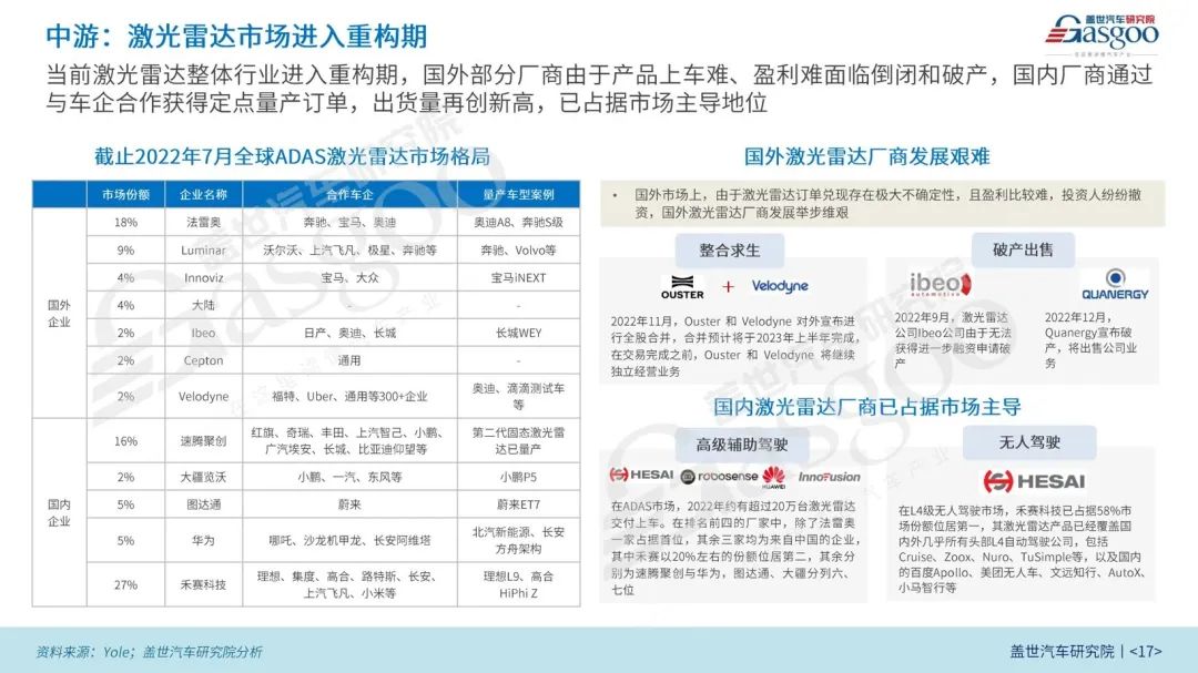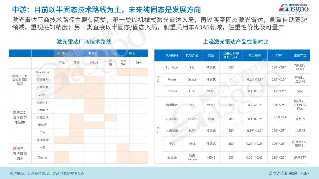 由于激光雷达尚处在量产初期,不同厂商选择不同技术路线进行探索时,还存在随技术演进取得性能及成本优势的可能性,竞争格局仍不稳定。根据盖世汽车研究院预测,还有⼀些激光雷达企业⽬前基本没有明确公开的配套⻋企,但都有⾃身独特的产品技术⽅案,凭借深耕细分技术领域与积累的客户资源网络,未来在激光雷达行业弯道超车也并非空想。