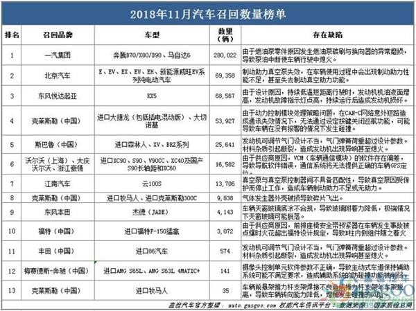 附:11月份国内汽车召回事件详细情况(按各批次召回数量排行次序排列)