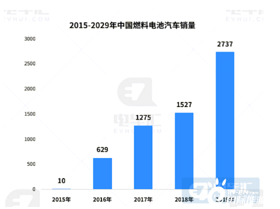 在市场端,燃料电池汽车发展同样较快,2015-2019年间,我国燃料电池汽车的销量分别为10辆、629辆、1275辆、1527辆、2737辆,2019年的销量是2015年的272.7倍。其中,2019年我国燃料电池汽车产销分别完成2833辆和2737辆,同比分别增长85.5%和79.2%。