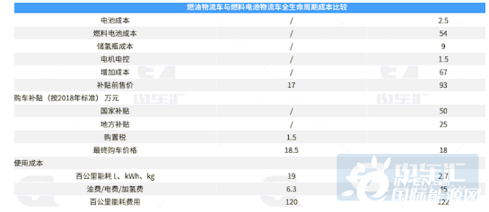 相较同类型的燃油车,燃料电池物流车成本增加了64万元。其中,燃料电池汽车新增成本集中在燃料电池系统和储氢系统。但是扣除补贴后,燃料电池车的购置成本与燃油车基本一致。