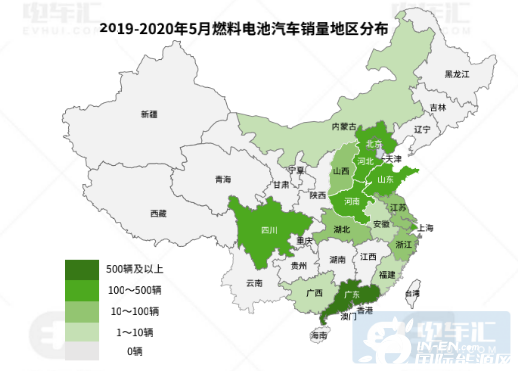 在2019-2020年5月燃料电池汽车销量中,分布最多的城市前十分别是:广州(450辆)、上海(311辆)、郑州(200辆)、佛山(135辆)、成都(110辆)、张家口(100辆)、南阳(72辆)、嘉兴(50辆)、济南(40辆)、潍坊(37辆)。与前面提到的燃料电池系统企业所在地基本一致。