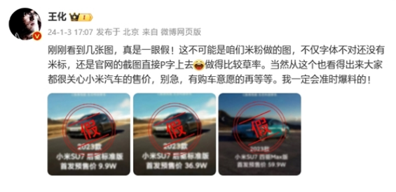 对此,小米公关负责人王化表示,这些图片一眼假,“不仅字体不对还没有米标,还是官网的截图直接P字上去”。
