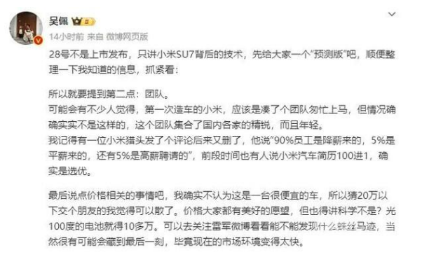 博主提到小米汽车团队时表示,这个团队集合了国内各家的精锐,而且年轻。他透露,有一位小米猎头曾声称小米汽车团队中,90%是降薪来的,5%是平薪来的,还有5%是高薪聘请的。此前还有消息称,小米汽车简历100进1,确实是选优。博主还透露,这次技术发布会还会有意料之外的大神出现,真正的汽车爱好者们可以期待一下。