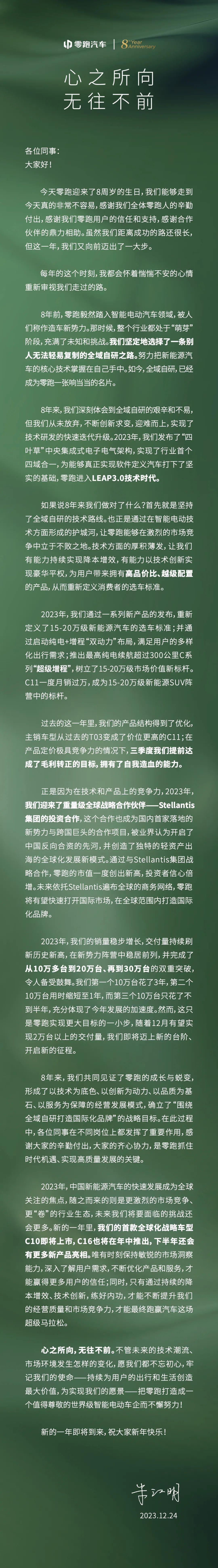 零跑创始人、董事长朱江明发布零跑汽车八周年公开信,他表示,零跑 8 年来坚持了全域自研的技术路线,在今年实现了行业首个座舱域、智驾域、动力域、车身域“四域合一”;第三季度提前达成了毛利转正的目前,拥有了用我造血的能力。