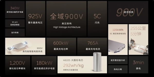 在电池与续航方面,蔚来ET9搭载国内首个“全域900V高压架构”,包含电池、电机、线束、空调、DC-DC、车载充电机等核心电子电器元件,拥有最高电压925V、充电峰值功率600kW、充电峰值电流765A的三项全球第一,刷新行业标准极限。