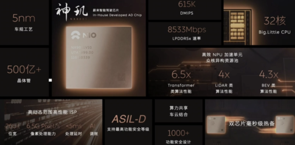 值得一提的是,蔚来ET9还搭载了蔚来首颗自研智能驾驶芯片——神玑NX9031。该芯片是业界首次采用5nm车规工艺制造的智能驾驶芯片,拥有超过500亿颗晶体管,通过自研的推理加速单元NPU(NPU TPP算力,Total Power Performance