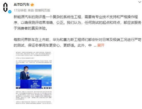 AITO汽车表示,新能源汽车的测评是一个复杂的系统性工程,需要有专业技术支持和严格操作程序,以确保测评结果准确、公正。我们认为,任何测试的起点和终点,都应该服务于消费者的真实体验。AITO汽车官方称,“我们希望看到更多科学、专业、严谨、公正的测试,为行业的发展带来真正的价值,也欢迎更多消费者前往我们在全国的门店及用户中心,了解真实车主的用车感受。”