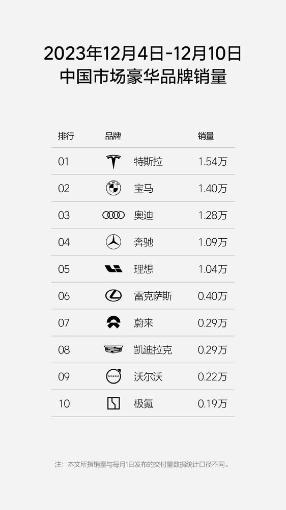 12月12日,造车新势力理想汽车再度公布了最新的周销量数据。理想汽车表示:2023年第50周(12.4-12.10),理想汽车周销量达1.04万辆。截至12月10日,理想汽车本月销量已达1.3万辆,稳居中国市场新势力品牌销量榜首。在中国市场新能源品牌销量方面,理想汽车位居第四,是榜单中排名最高的中国豪华品牌。理想汽车也继续保持中国市场豪华品牌销量前五,是榜单中排名最高的中国品牌。