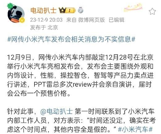 针对这个传闻,小米汽车内部工作人员表示:“时间还没定,确实在考虑这个时间点,其他内容全是假的。”