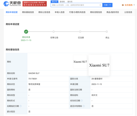 12月1日消息,据天眼查显示,近日,小米科技有限责任公司申请注册“XIAOMI SU7”商标,当前商标状态为等待实质审查。