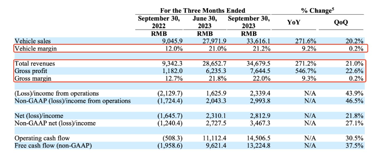 其中,理想汽车第三季度车辆毛利率为21.2%,比去年同期提升超 9 个百分点。