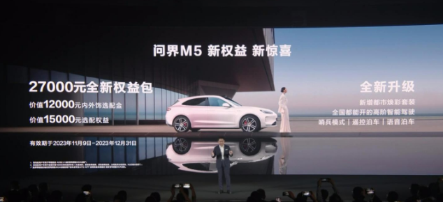 在11月9日的华为智慧出行解决方案发布会期间,华为常务董事、终端 BG CEO、智能汽车解决方案 BU 董事长余承东为问界 M5 车型推出了一套价值 27000 元的全新权益包。此外,余承东宣布问界 M5 车型累计交付已经突破 12 万台。