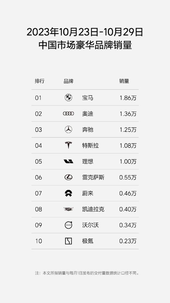 值得一提的是,就在今天,理想汽车官方宣布,在刚刚过去的2023年第44周(10.23-10.29),理想汽车的周销量达1万辆,持续领跑新势力。在中国市场新能源品牌销量方面,理想汽车跻身前三,是榜单中排名最高的豪华品牌。截至10月29日,理想汽车本月销量已达3.68万辆,在中国市场豪华品牌排行榜中稳居第四,是榜单中排名最高的中国品牌。