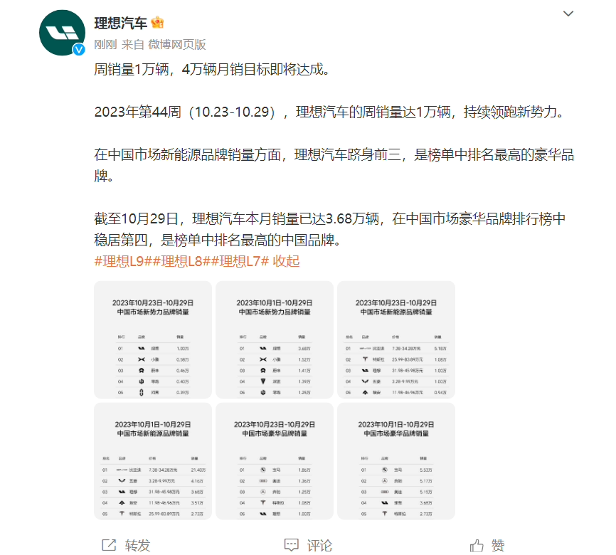 10月31日,理想汽车公布第44周(10.23-10.29)销量,本周销量1万辆,4万辆月销目标即将达成。截至10月29日,理想汽车本月销量已达3.68万辆。