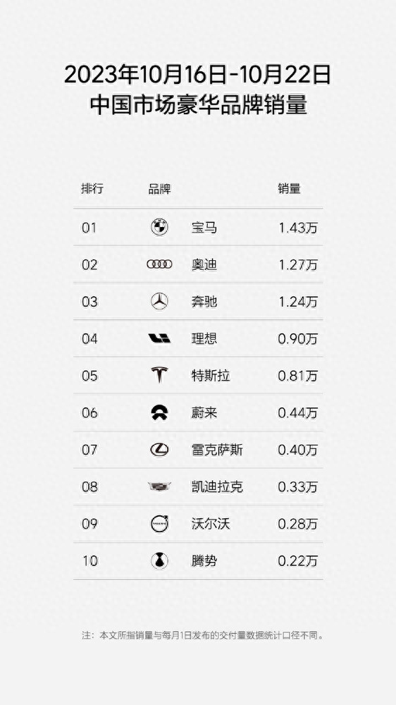 中国市场豪华品牌销量方面(10.16-10.22),宝马、奔驰、奥迪周销量分别为1.43万辆、1.27万辆、1.24万辆,分别位列第一、第二、第三;理想汽车以0.9万辆位居第四,特斯拉紧随其后,周销量达0.81万辆,位居第五。