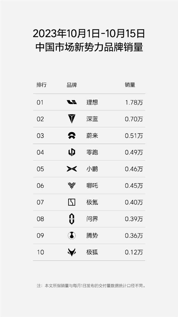 在刚刚过去的2023年第42周(10.9-10.15),理想汽车周销量达1.05万辆,仅次于BBA等豪华品牌,是榜单中排名最高的中国品牌,而截至10月15日,理想汽车本月销量已达1.78万辆,持续领跑新势力,本月销量突破4万基本板上钉钉。