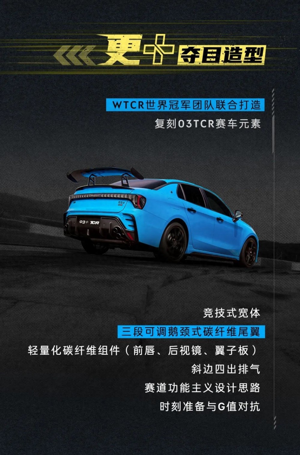 从外观上看,领克 03++ 与领克 03 + 基本保持一致,但在细节上有所区别。新车将会拥有竞技式宽体、三段可调鹅颈式碳纤维尾翼、轻量化碳纤维组件(前唇、后视镜、翼子板)、斜边四出排气等装备,官方表示其“随时准备与 G 值对抗”。