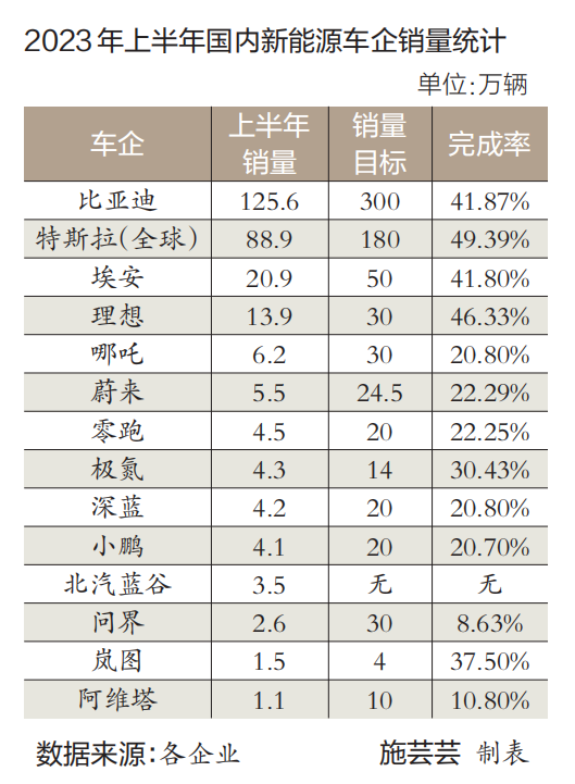 公开信息显示,当前已经有十几家新能源车企陆续公布了今年上半年的销量成绩单,但与其各自制定的年初目标相比,完成度超过50%的几乎没有。