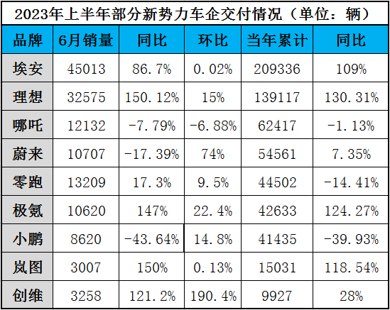 从上半年整体表现来看,埃安和理想交付量均超过10万辆,哪吒、蔚来、零跑、极氪、小鹏的交付量均超过4万辆。